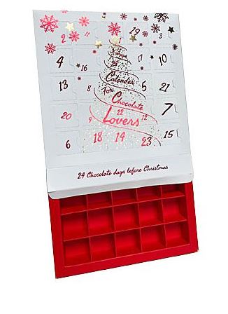 Valge jõulukujundusega esipaneel peidab endas 24 avakest, mille taga on ruum väikestele maiustele. Kalender avaneb alt üles, paljastades punase sisemuse ja 24 eraldi lahtriga vormi, mis hoiab maiused puhtalt ja korrektselt oma kohal.