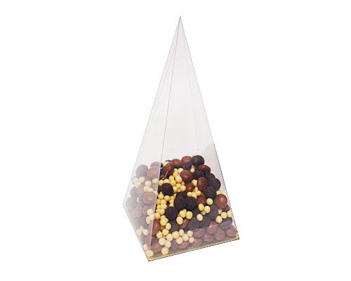Elegantne läbipaistev püramiidpakend mõõtmetega 90 × 90 × 200 mm koos kuldse kartonist põhjaga – ideaalne šokolaadide, maiustuste või kingituspakendite esitlemiseks.