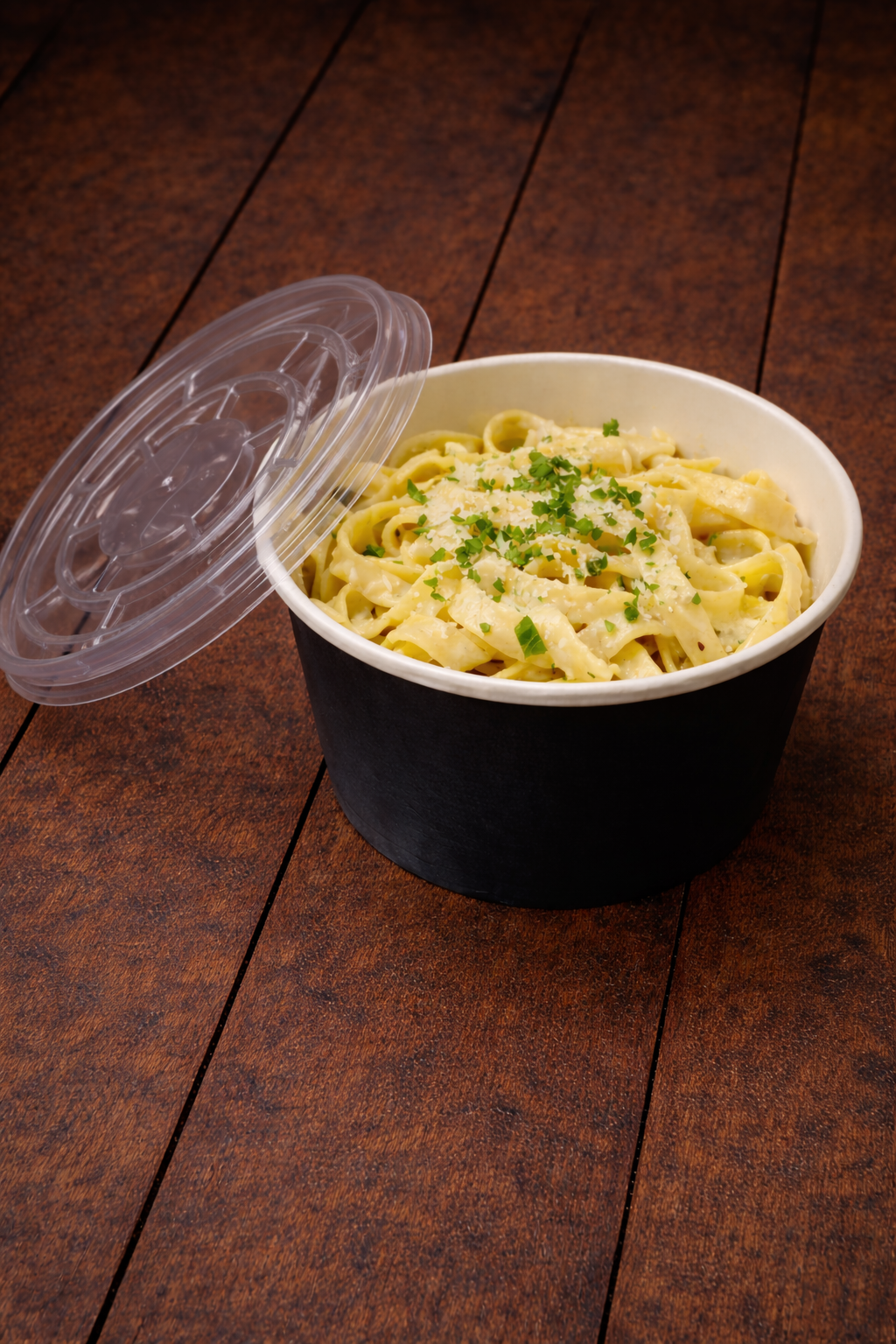 Must kartongist tops 480 ml on praktiline ja vastupidav pakend salatite, valmistoitude ja muude külmade või soojade roogade kaasamüügiks. Tops on seest kaetud polüetüleenkattega, mis muudab selle vedeliku- ja rasvakindlaks ning sobivaks erinevate toitude pakendamiseks.