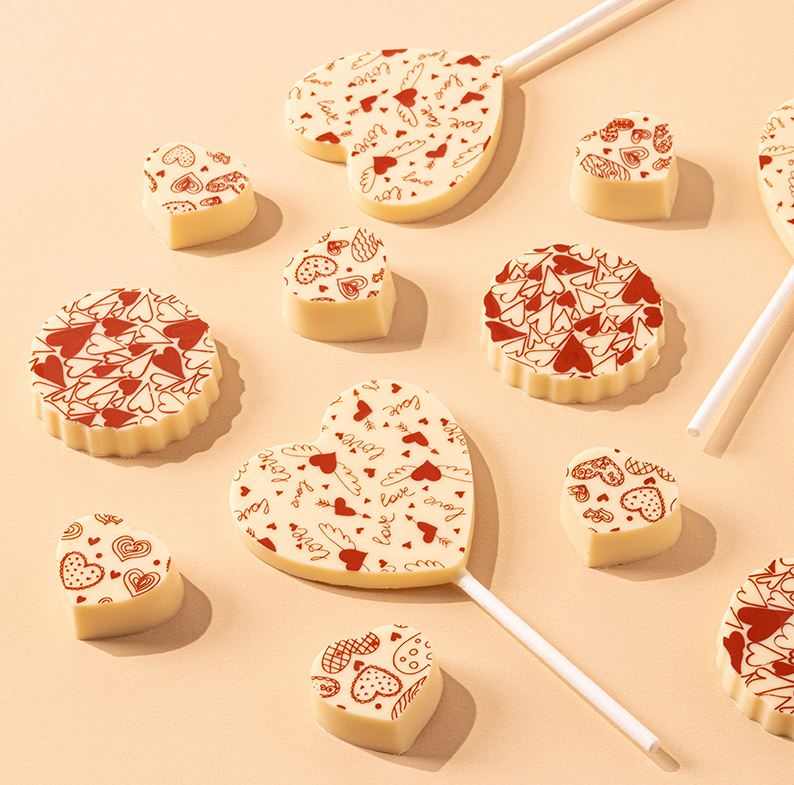 Šokolaadikile SÜDAMED 30×40 cm, pakis 30 tk. Sobib šokolaadi, pralineede ja trühvlite dekoorimiseks.